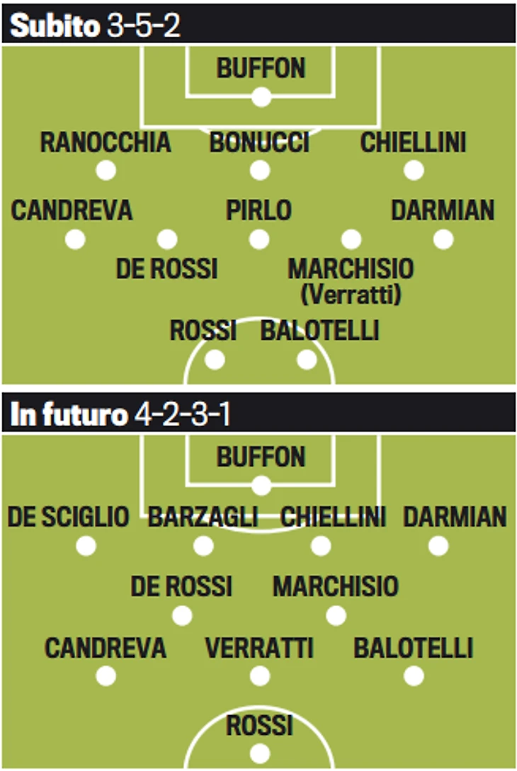 Существует две схемы, которые, скорее всего, станут основными: 3-5-2 и 4-2-3-1. Как и полагается, на воротах Джанлуиджи Буффон. Никто не сомневается, что в центре вышел бы Андреа Бардзальи, но игрок восстанавливается от травмы. Возможно, что Конте обратится к услугам Андреа Раноккья, которого он тренировал в "Бари". Далее Леонардо Бонуччи или Даниэле Де Росси, который уже выступал в центре обороны при Пранделли, правда, игрок "Ромы" больше пригодится при Клаудио Маркизио и Андреа Пирло. Невозможно проигнорировать Верратти, особенно учитывая дисквалификацию на матч с Норвегией Маркизио. На флангах могут действовать Маттео Дармиан и Антонио Кандрева. Карлос Тевес аргентинец, потому берем Джузеппе Росси, а вместо Фернандо Льоренте - Марио Балотелли, который имеет хорошие данные, но откровенно провалился на мундиале.