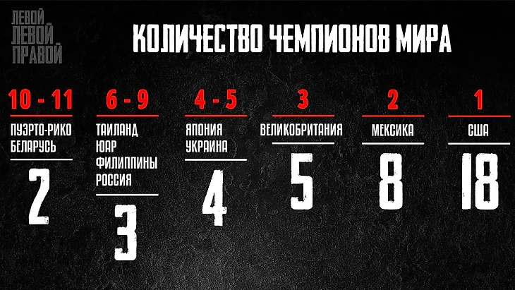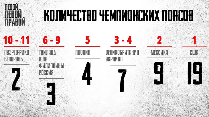 Так выглядит топ-10 стран по количеству чемпионов мира (не поясов).