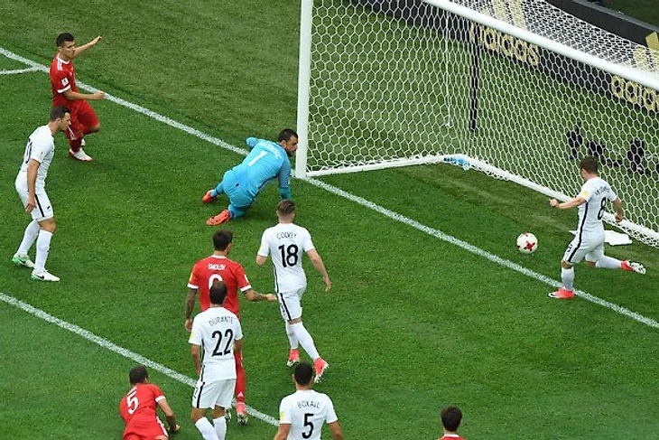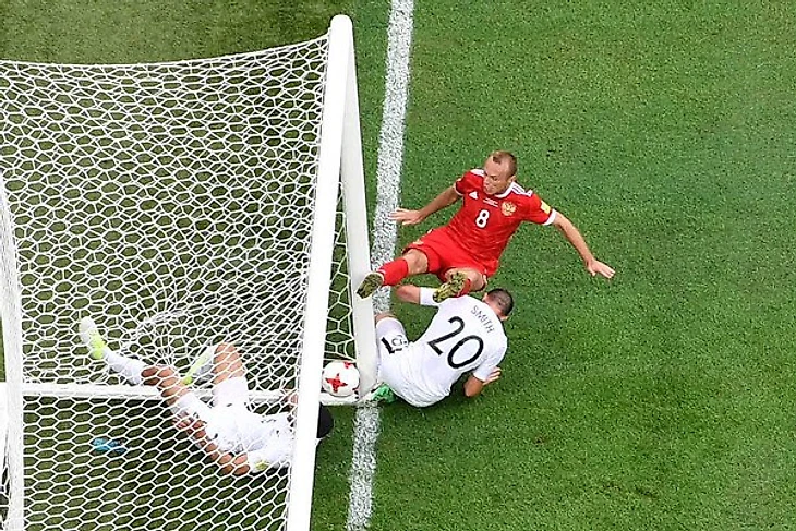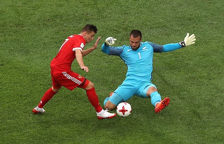 Через 2 минуты свой момент уже имел и Дмитрий Полоз. От гола новозеландцев спас Томми Смит, выбивший мяч за пределы поля после несильного удара россиянина.