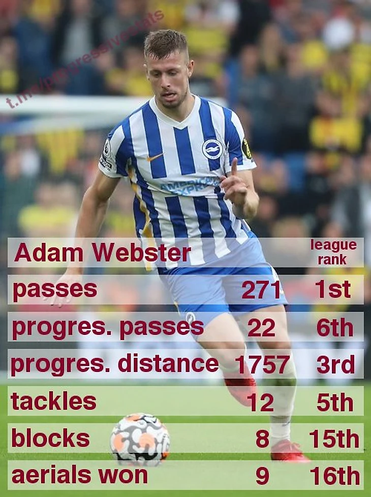 Адам Уэбстер играет ключевую роль в билдапе Чаек, он лучший в лиге по количеству передач и шестой по пасам, продвигающим атаку (progressive passes). Для сравнения, капитан Брайтона Льюис Данк выполнил на 50 передач меньше и имеет в своем активе всего 1 продвигающий пас (против 22 у Уэбстера).