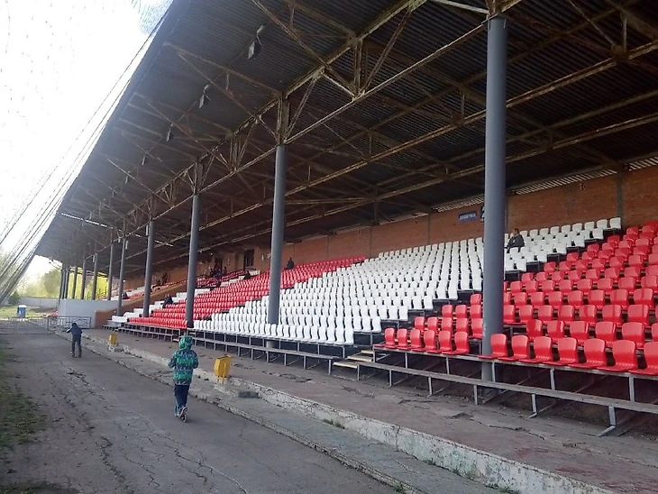 Да, довольно неказистый вход, без колонн и античных статуй, но внутри была довольно уютная арена с крытыми трибунами, что в последние дни в нашей области как никогда актуально! Впрочем, дождя впервые за несколько дней не случилось и даже выглянуло солнце, хотя и дул довольно неприятный холодный ветер.