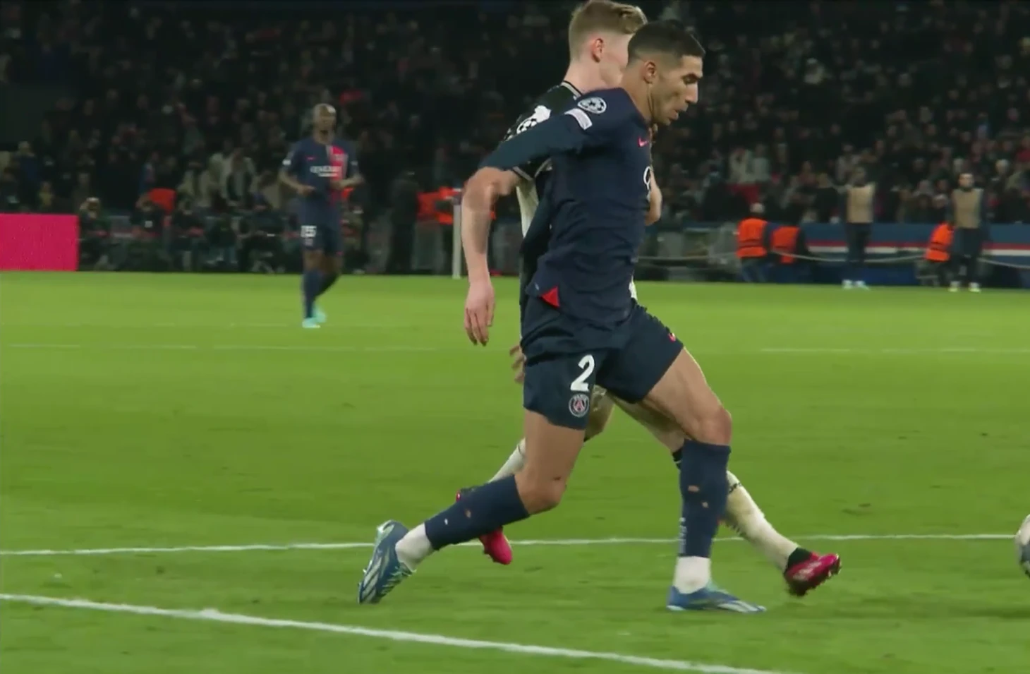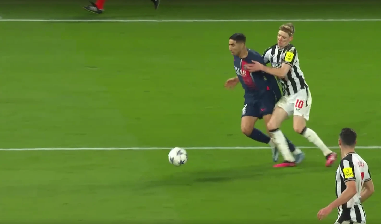 Вернёмся к матчу «Пари Сен-Жермен» - «Ньюкасл», который во вторник очень горячо обсуждали (особенно спорный пенальти на 98 минуте игры). Пенальти вызвал бурю эмоций и хейт в сторону судьи матча Шимона Марциняка, но на 68 минуте в штрафной английской команды был не менее спорный эпизод с участием Ашраф Хакими и Энтони Гордоном.