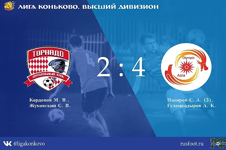 Матч года! Во всяком случае так «говорила» турнирная таблица. У команд было равное количество очков - 58. Небольшое преимущество имела команда Торнадо, благодаря победе в первом круге 5:2. Но здесь, в этой игре было поставлено все на кон: победитель фактически становился чемпионом Лиги Коньково, с небольшой оговоркой для Olympic Asia (им надо было тогда еще не проиграть в последнем матче ЛФК Чебурашка). Футбол- не просто игра! Футбол- это удовольствие, радость, восторг!!! По итогу матча все вышеперечисленное получили игроки Olympic Asia!!! А что Торнадо? Торнадо было бледной тенью самой себя. Все, что команда показывала до этого, просто исчезло. Хотя, есть мнение, что Olympic Asia, просто не позволило Торнадо сыграть в свою игру. Asia сыграла по чемпионски - игроки летали по полю. Их лидер и звездочка нашей лиги Назиров , просто разрывал оборонные редуты Торнадо. Торнадо ошибалось, что привело к первому забитому голу во время углового. Грубая ошибка защитника Кузьмина и другой защитник, но уже Asia Гуламкадыров, головой вколачивает мяч в ворота Торнадо. Вратарь был бессилен, да и не мог он этого предвидеть. У Торнадо появился шанс, когда они(возможно и спорного) забили гол с пенальти- 1:1. Но это был не день Торнадо- 13 сентября! И даже более, 100% пенальти, который не увидел судья(игрок Asia сыграл рукой в штрафной площади), думается не спасли бы Торнадо от поражения в этот день. Ничего у них не получалось. Жаринов мог дважды вернуть в игру свою команду, но не смог из убойных позиций поразить ворота соперника, зато в защите "дал жару", пару раз вынес мяч из пустых ворот. У вратаря Olympic было мало работы. Напротив, его оппонент Тимофеев Михаил , крутился как «белка в колесе», раз за разом выручая свою команду. Хочется отметить Ахмаджанова Достана, защитника Olympic Asia, который просто все «выгрызал» и внес весомый вклад в победу своей команды. Olympic Asia побеждает и на 90% она Чемпион! Но, смотрим следующий матч: