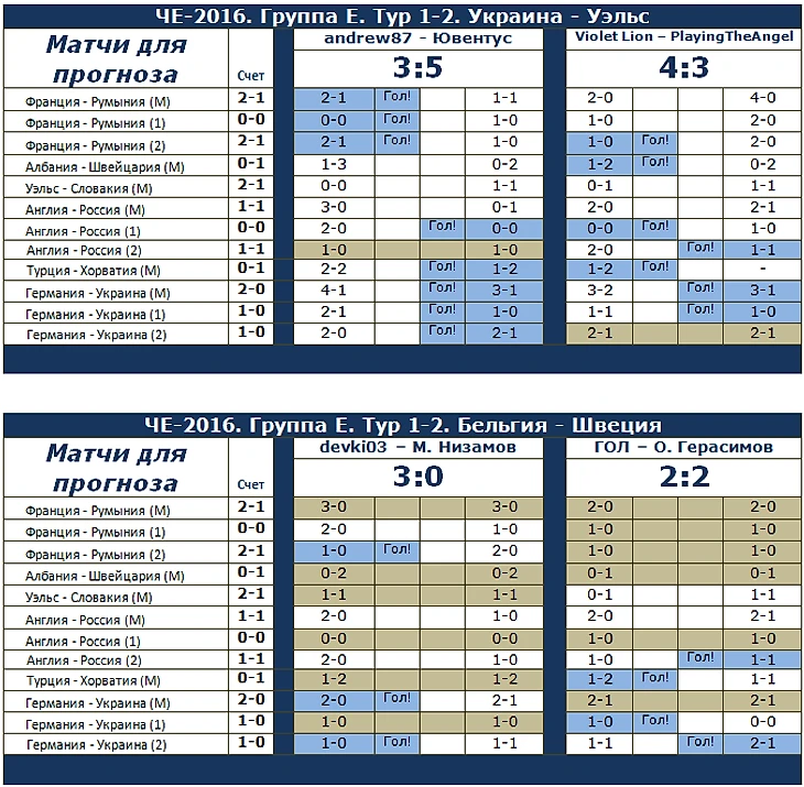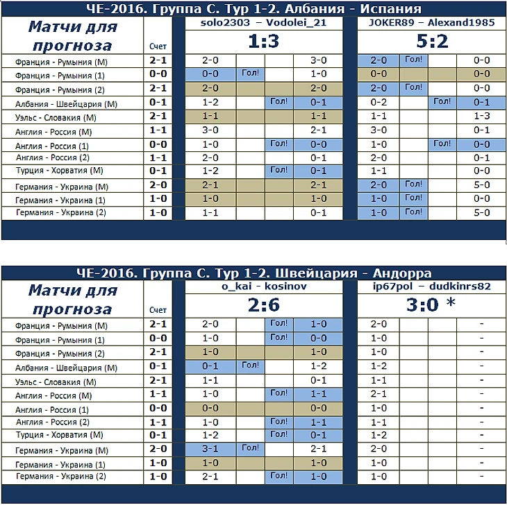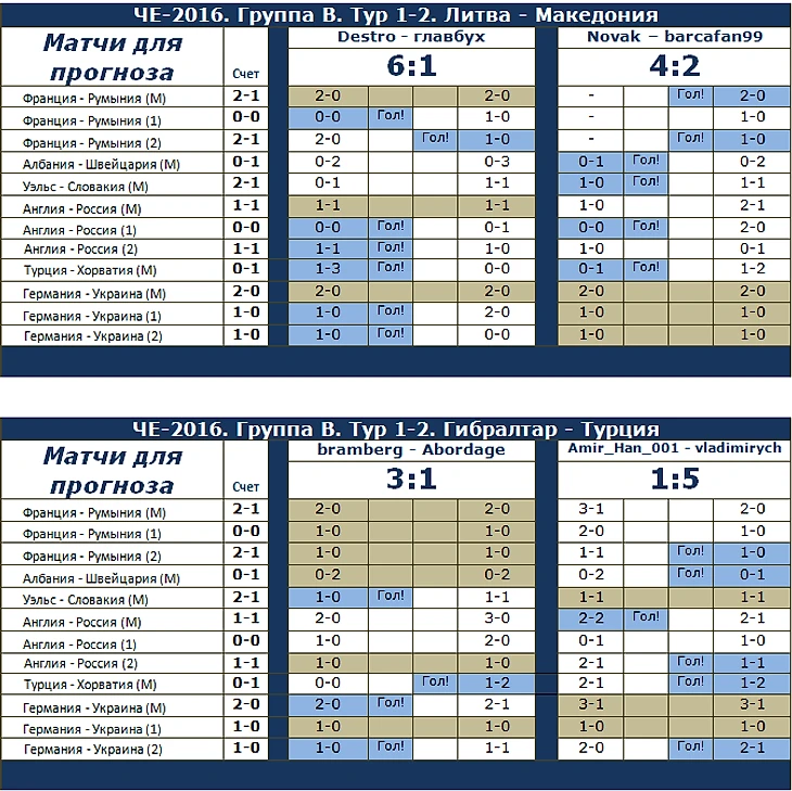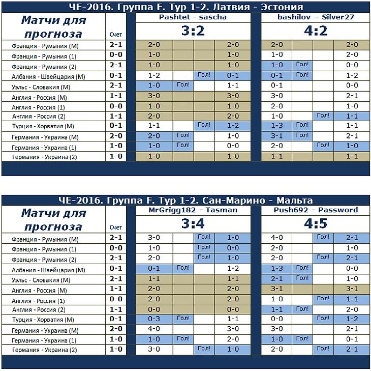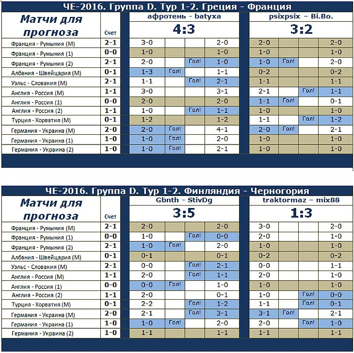 К дедлайну не успели 10 человек из 48; из этих 10 двое - Novak (Литва) и AlexG1991 (Ирландия) - опоздали и отправили свои прогнозы без предсказания матча открытия Евро-16 и, соответственно, получили 0:2.