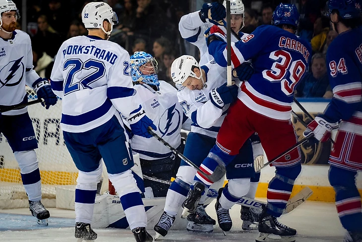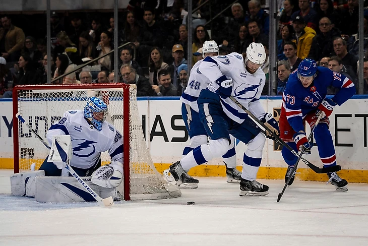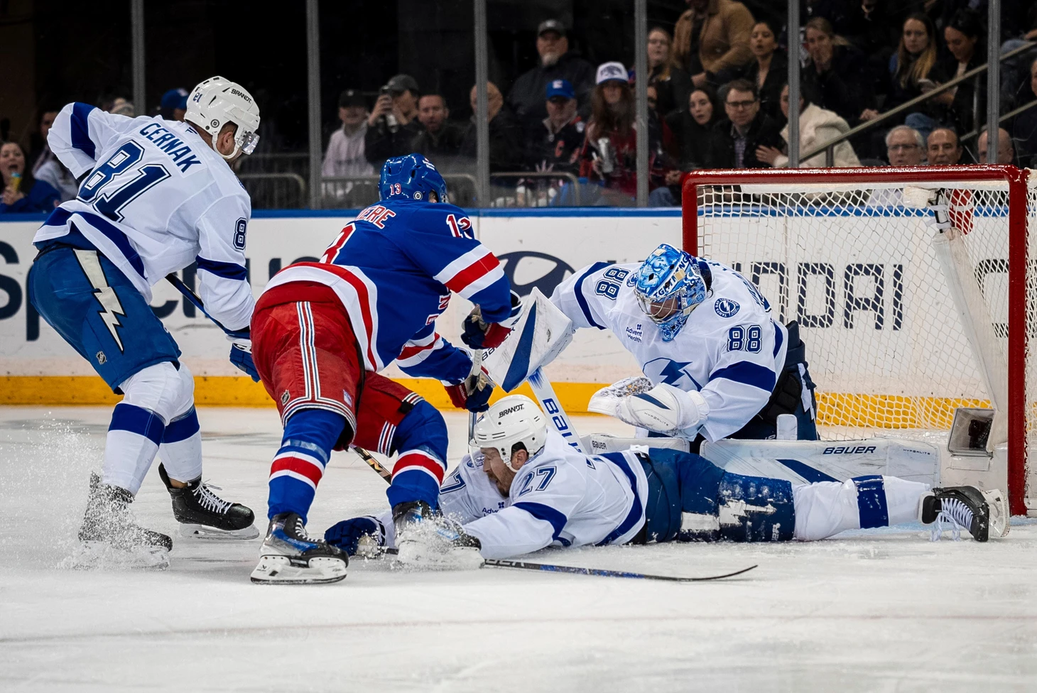 Начало игры не предвещало разгрома. «Рейнджерс» доминировали первые 13 минут, перебросав «Лайтнинг» 11-1 и задавив их в зоне. Василевский, в своём 60-м старте сезона — больше всех в лиге, — держал ворота на замке, отразив 17 бросков подряд. «Мы слишком много времени провели в своей зоне», — отметил Райан МакДона, указав на необходимость упрощать игру и «переключаться на скорость». Перелом наступил на 13-й минуте 9-й секунде, когда «Тампа» получила большинство. Кучеров, получив шайбу от Пойнта, прошёл двоих защитников и замкнул атаку у дальней штанги — 1:0.