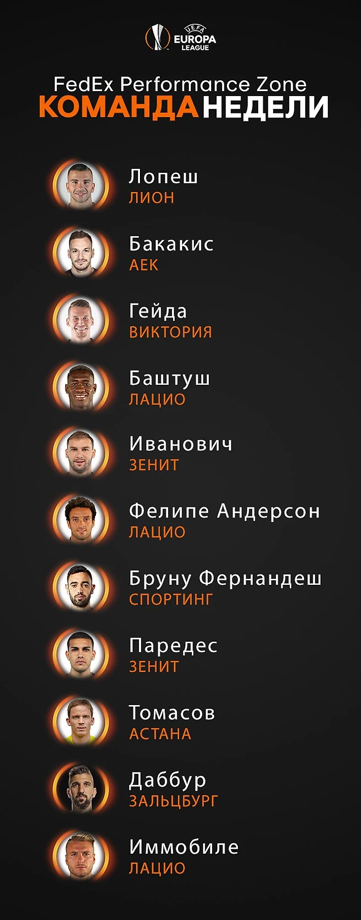 ПОЛУЗАЩИТНИКИ: Фелипе Андерсон ("Лацио") - Общий рейтинг: 4 (+167); Бруну Фернандеш ("Спортинг") - Общий рейтинг: 1 (+2); Леандро Паредес ("Зенит") - Общий рейтинг: 93 (+188); Марин Томасов ("Астана") - Общий рейтинг: 67 (+297);