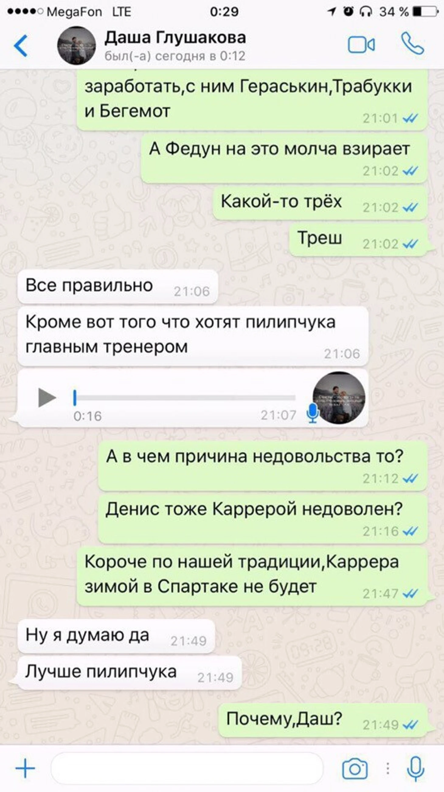 В сети появляются скрины переписок жены футболиста с неким болельщиком «Спартака». Датируются они сентябрем 2017. Но все ли так однозначно? Мы видим не только текст, но еще и аудио, в которых говориться о чем угодно. Может недовольство выбранным галстуком Карреры, а может еще чего. Но это все не так однозначно.