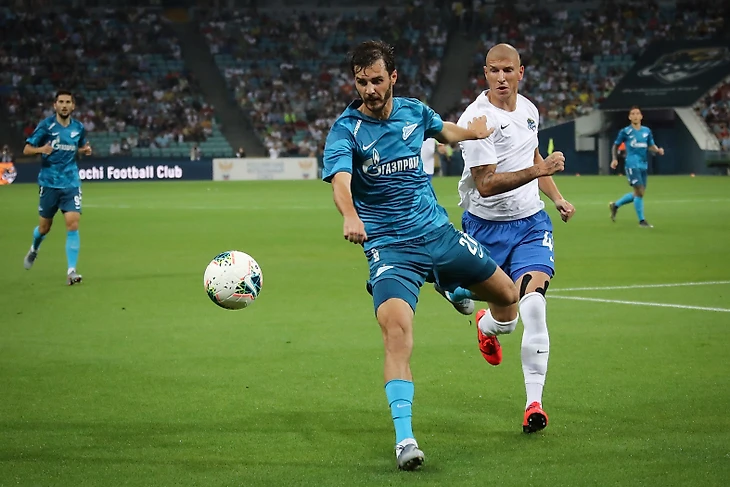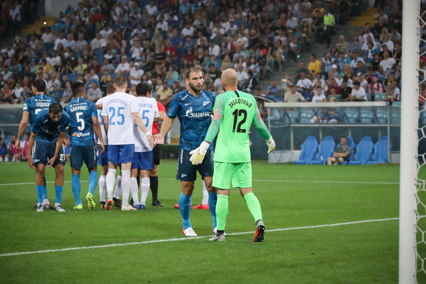 Обе команды удивили стартовыми составами: у хозяев отсутствовал Полоз, а вот у гостей Артём Дзюба, который простудился, но все же приехал вместе с командой. Также стоит отметить появление в стартовом составе Алексея Сутормина. Первые 15-минут «Сочи» показывал свой футбол: владел мячом, хорошо выходил в прессинг, но особо опасными моментами нас не удивил. Примерно на 20 минуте «Зенит» перехватил преимущество, а вместе с ним и мяч. Первый опасный удар нанес Оздоев, на экваторе первого тайма. А буквально в следующей же атаке, Сердар Азмун выбежал один на один с вратарем, обыграл его, но ударить не успел, а всему виной Миладинович – защитник нарушивший правила в своей штрафной. Серб получил желтую карточку, которую долго оспаривали футболисты и скамейка «Зенита», просившая красную. К точке подошел сам Сердар, и уверенно реализовал 11-метровый удар.