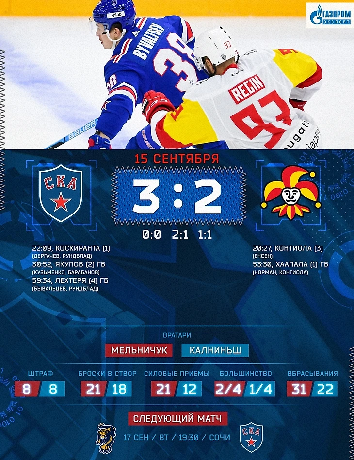 Героем встречи стал Йори Лехтяря. За 2 минуты до конца игры "шуты" остались в меньшинстве. Игроки СКА смогли закрепиться в чужой зоне. После серии передач шайба дошла до Рундблада, швед щелкнул уже и от клюшки двенадцатого номера армейцев шайба проскочила через голкипера "Йокерита". Итоговый счёт 3:2 установился за 32 секунды до конца игры.