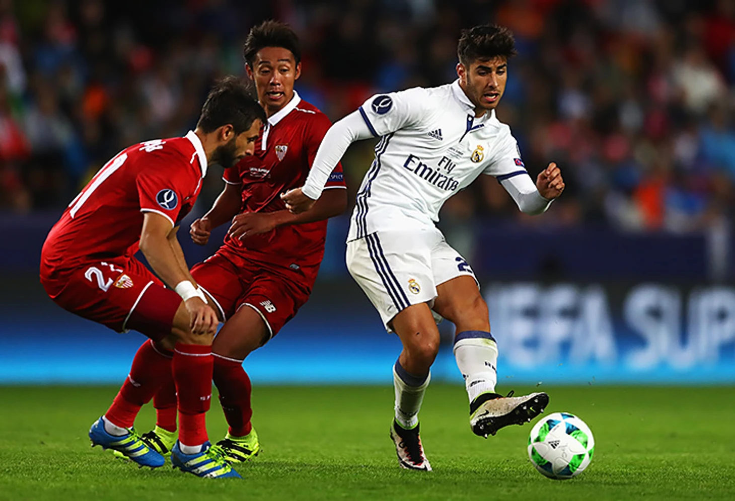 Так и произошло, и с 26-м номером на спине Асенсио вышел на матч Суперкубка Европы против «Севильи». Тогда, в августе 2016-го, о нем узнали абсолютно все. Первый гол за «Реал» Марко забил на норвежском стадиончике в Тронхейме: он получил мяч, определил положение вратаря и пробил с левой — перекинул мяч через спины севильских защитников, с 25 метров поразив ворота Серхио Рико.