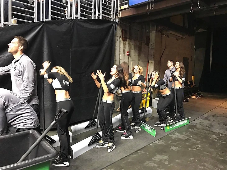Неожиданно к нам с Генри подошли симпатичные девушки в экипировке «Кингс», с наушниками, как у тренеров в американском футболе, но с более приятной, чем у них, комплекцией. Девчонки работают в клубе и делают так, чтобы во время игры не было пауз. Поэтому любую остановку и каждый из 17-минутных перерывов превращают в веселье, хорошо продуманную клоунаду или просто зрелище. То, что предложили нам, оказалось чем-то средним и уж точно поинтереснее Матча всех звезд, который проходил на том же льду за несколько дней до нас.