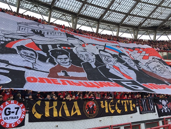 Фанаты на красной стороне стадиона устроили показ баннеров: передали привет журналистам из BBC, а потом подсказали редакции Sports.ru, с кем еще поговорить о последнем чемпионстве «Спартака»: Сергеем Лавровым, Денисом Мацуевым и Дмитрием Назаровым. Алексей Маклаков уже был, а Олег Табаков через своих театральных замов пообещал отвести спартаковцев в МХТ, если они займут первое место.