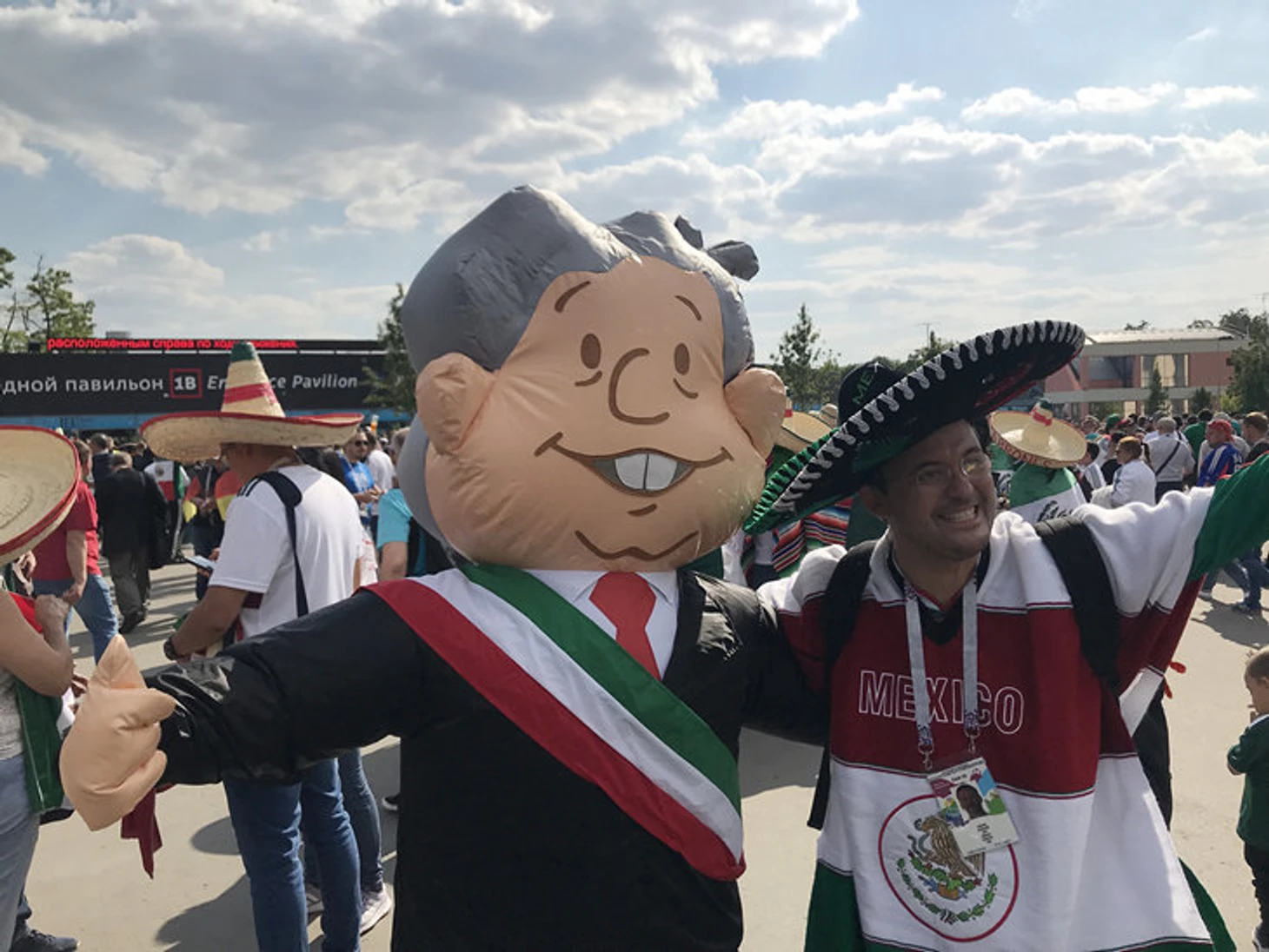 Парень в надувном костюме кандидата в президенты Андреса Мануэля Обрадора. Говорят, в Мексике его обожают и он обязательно победит.