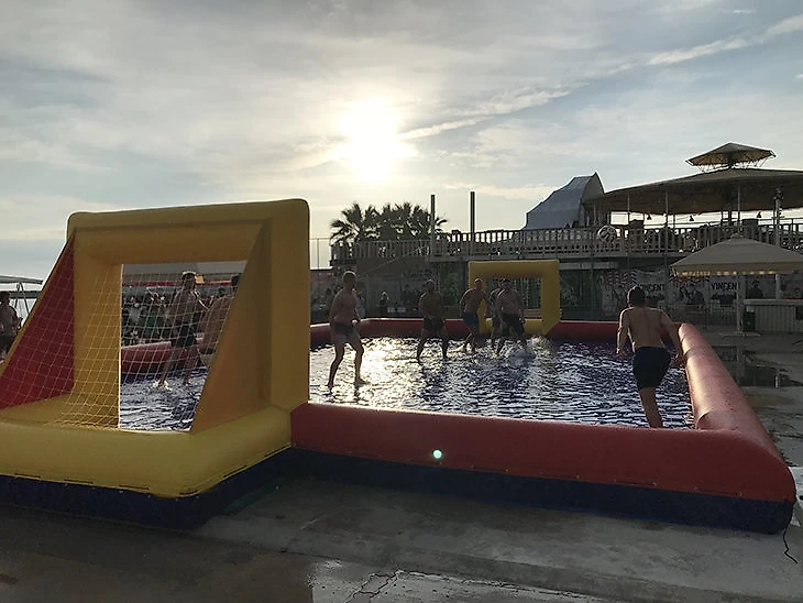 Шведы играли в футбол внутри надувного бассейна с воротами. 25 минут игры – 100 рублей с человека.