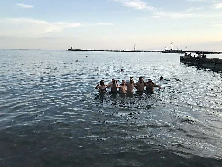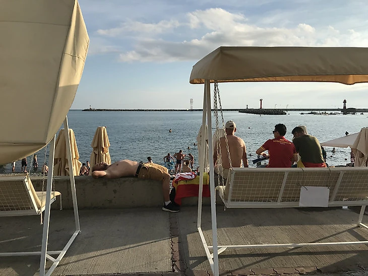Футбол здесь смотрят на большом экране в районе порта и прямо у Черного моря. В перерывах между трансляциями болельщики уходят на часовые купания. Видеть столько людей в атрибутике на стереотипном каменном пляже, в деревянной душевой с пресной водой и переодевающими плавки под полотенцем – бесценное приключение.