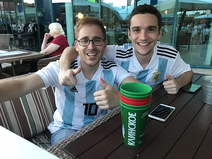 Роберто и Ганс в футболках сборной Аргентины представились болельщиками Испании. Все верно – в фан-зоне поменялись формами с аргентинцами, а во время матча Перу – Дания сидели на открытой веранде, пили пиво и наслаждались вечером.