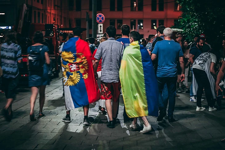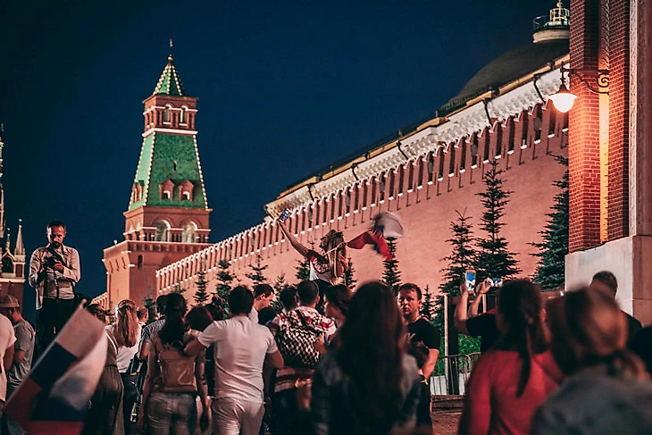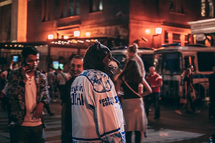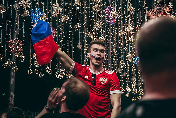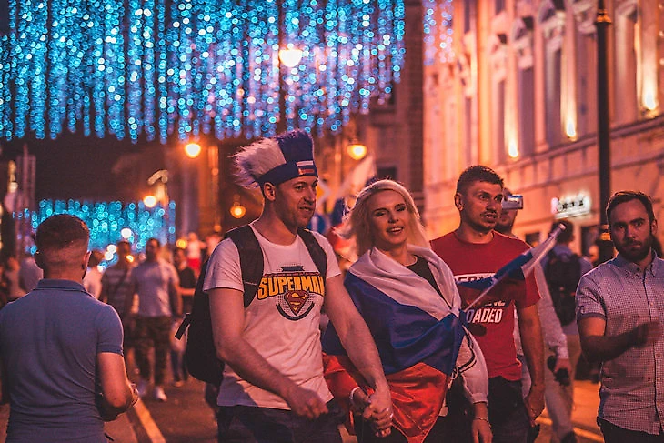Первый – уважение. Наступил на ногу, загородил объектив, случайно стащил на землю во время танца флаг – тысяча извинений, помощь и улыбки. В метро бабули давали ребятам салфетки, чтобы стереть пот. Это работало и на Никольской (где под ногами хрустело стекло, а в углах отливали болельщики) – там из-за плотности движения пешеходы постоянно врезались и каждое такое столкновение переводили в шутку или дружбу. И в других местах, где счастливые русские люди выглядели самой опрятной и добродетельной нацией.