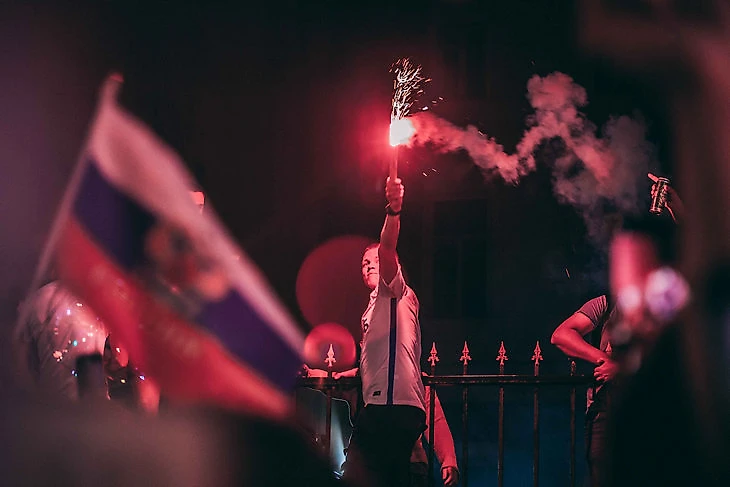 Через час после матча и мощной речи Артема Дзюбы хотелось праздника здесь и сейчас. Но у стадиона ходили только стюарды, какие-то сотрудники и редкие болельщики. Где праздник? Где громкие слова во славу России, Дзюбы, Акинфеева? Прорвавшись через красную линию метро, где пару раз заряжали про сборную, но большинство стеснительно отводили взгляд и прятались за мобильные телефоны, я добрался в центр Москвы – и тут началось!