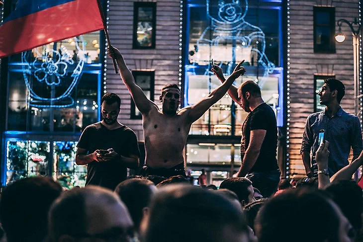 Под электронную (что-то мощное и без слов), народную (Катюша, Калинка, «Только мы с конем»), современную («Ленинград») народ плясал, люди обхватывали незнакомые плечи, чекались банками, бутылками и бокалами (сегодня можно все) и хватались за голову, потому что не могли поверить. Даже на восьмом абзаце этого текста мне приходится переспрашивать: Россия, чемпионат мира, четвертьфинал, точно?