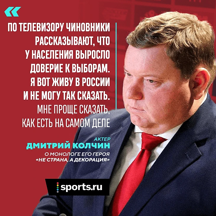В последней серии герой Колчина произнес смелый монолог «Не страна, а декорация» – в окружении чиновников и карикатурного персонажа Леонтия Витальевича он раскритиковал наш спорт, футбольную систему и агентов, обличая бюрократию и коррупцию: «У нас же все так. Дороги когда ремонтируют – президент приезжает. Мост строят, когда саммит какой. На курорте порядок навести – только если Олимпиада, только вот в этом случае. Ну можно же что-то сделать? У нас не страна, а декорация какая-то! Можно же сделать не для декорации, не для отчетов».