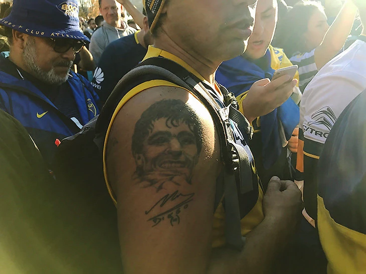 Забор превратился в баннерную линию: там отмечались фанаты «Боки» из Валенсии, Ибицы, Кувейта. Такой разнообразной атрибутики я не видел никогда: футболки, свитера, вязаные шапки, треники, панамки. У многих набита эмблема «Боки» (в основном на сердце) или бог – Диего.