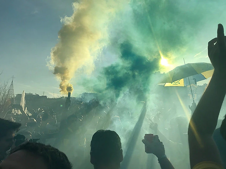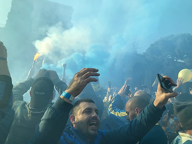 Когда свободу захотели прервать – в толпу въехала полицейская машина с мигалками, оказалось, так она срезала путь – «Бока» завелась и раскалилась еще сильнее. Люди с зонтами в цветах клуба запрыгали еще выше, от свиста улетали пластиковые стаканы, слышался мат в сторону полицейских. «Бока» веселилась и готовилась к матчу.