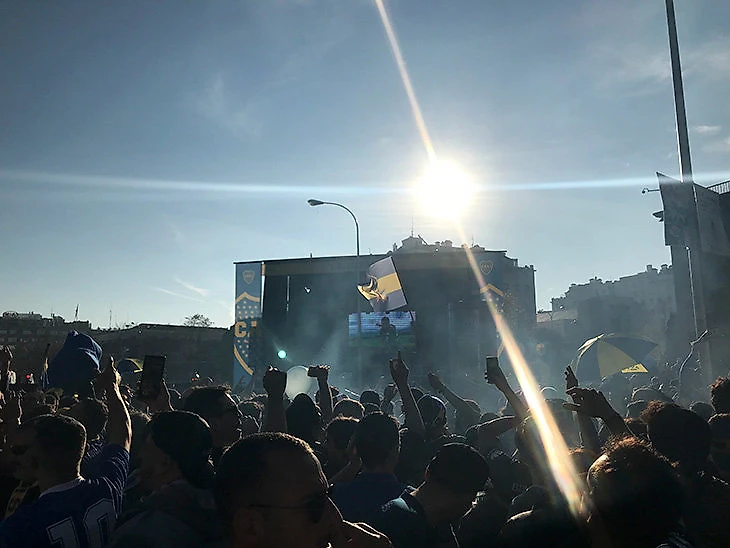 За час на фан-зоне «Боки» я видел непрерывное представление из неповторяющихся элементов: флаги, разноцветный дым, пиротехника, песни, танцы и прыжки смешивались, меняли друг друга; их подхватывали задние ряды. Хриплые аргентинцы с крестами на выпуск окатили меня стойким виноградным дыханием: они видели во мне иностранца и хотели поделиться чувствами к «Боке». У их клуба такое короткое название, и ему легко признаваться в любви: просто произносить «Бока» по много раз, улыбаться, желательно кого-то обнимать и не проливать пиво.