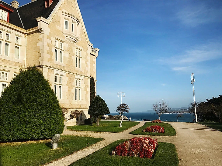 Рауль поднимает нас по крутым дорожкам до светлого королевского дворца Ла-Магдалена: перед ним четкие зеленые треугольники и посадки красно-розовых цветов.