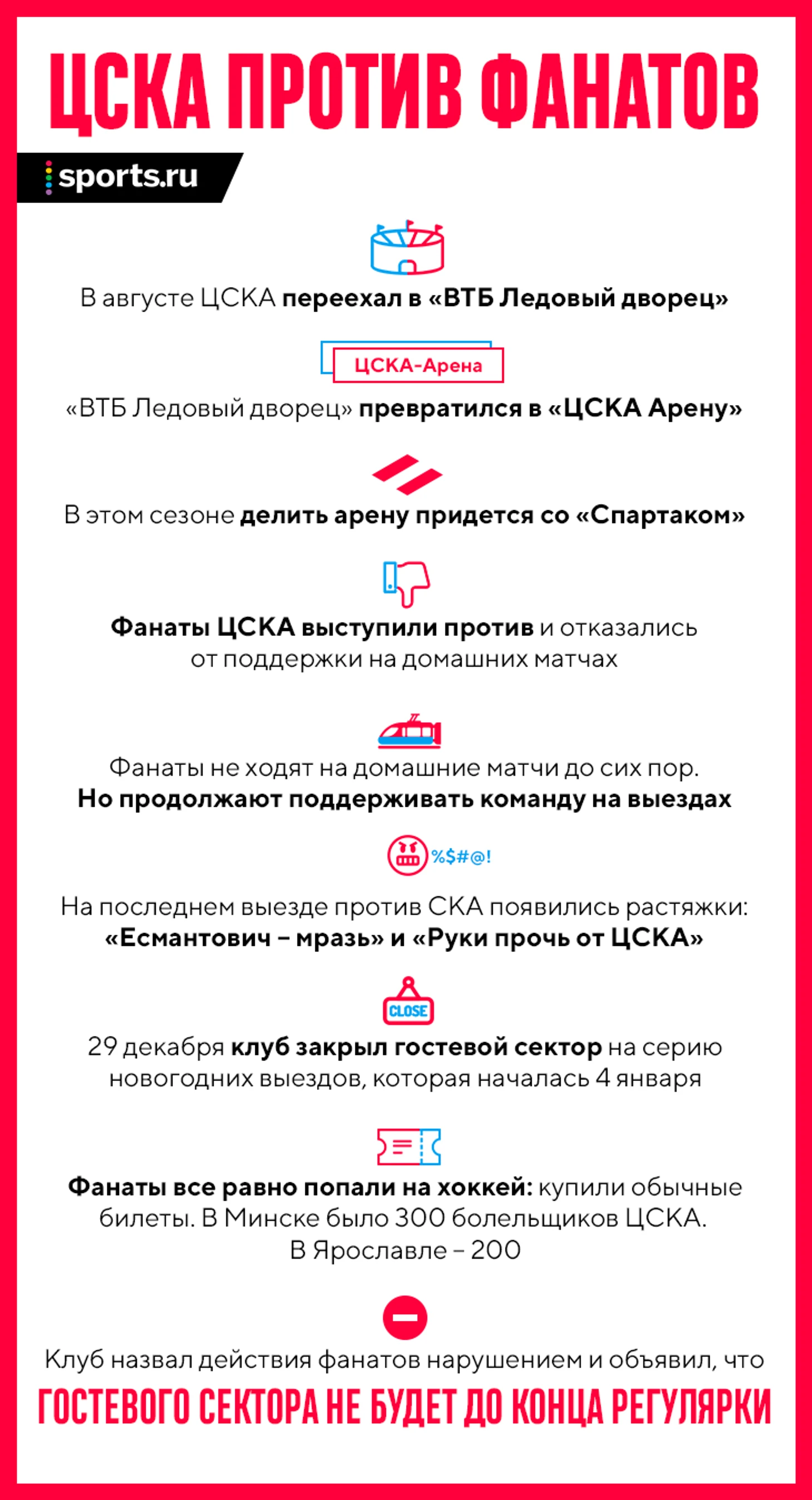 29 декабря клуб закрыл гостевой сектор на новогодние матчи (против «Витязя», минского «Динамо» и «Локомотива»), куда традиционно приезжает много болельщиков. Если Подольск («Витязь») – недолгая вылазка из Москвы и за выезд у фанатов не считается, то Минск и Ярославль – полноценные путешествия, куда болельщики брали билеты заранее. Еще одно неудобство – клуб сообщил о закрытии за восемь дней до выезда в Минск.