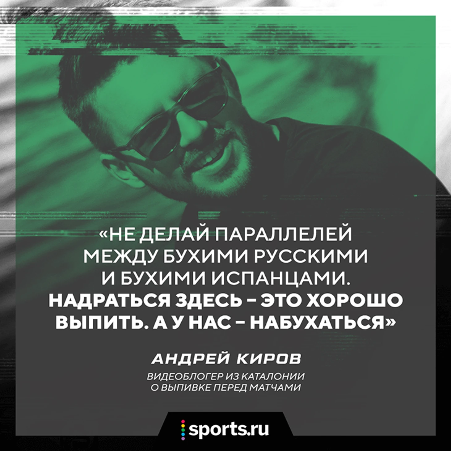 – Конечно, почему нет? Но не делай параллелей между бухими русскими и бухими испанцами. Надраться здесь – это хорошо выпить. А у нас – набухаться. Мы сейчас с тобой выпили по два стаканчика. Они естественно выпивают побольше, пару джин-тоников и пару пив: ты подпитый, навеселе, орешь, идешь на стадион, потом ложишься спать в автобусе. Прямо чтобы в говно – я не видел ни разу.