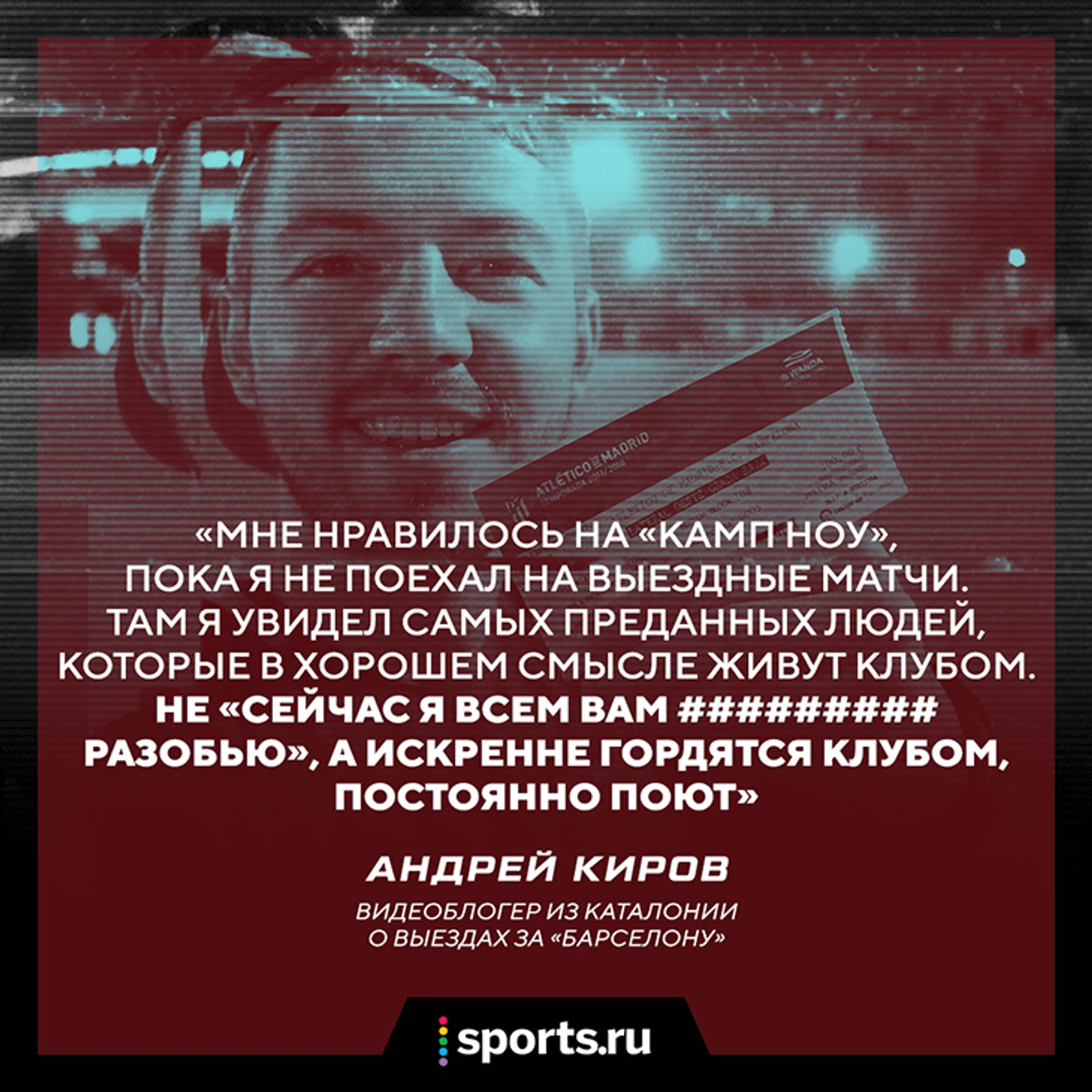 Мне нравилось на «Камп Ноу», пока я не поехал на выездные матчи. Там я увидел самых преданных людей, которые в хорошем смысле живут клубом. Не «Сейчас я всем вам ######### [лица] разобью», а искренне гордятся клубом, постоянно поют. Футбол в Испании – семейное мероприятие. С нами ездят и пенсионеры, и ребята с синдромом Дауна.