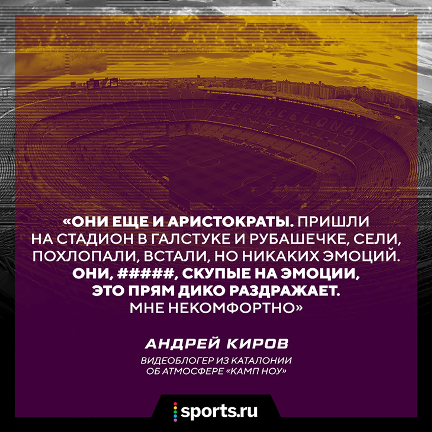 Каталонцы зажрались. Для них сложилась картинка, что «Барселона» – это триплет каждый год, а плохой сезон – когда этого триплета нет. Они еще и аристократы. Пришли на стадион в галстуке и рубашечке, сели, похлопали, встали, но никаких эмоций. А те, кто гоняют на выезда – и в возрасте, и молодые, и повернутые – орут, знают кричалки. Если посмотришь на «Камп Ноу» (99 тысяч 700 зрителей), поет только ля града (фанатская трибуна – Sports.ru) на северном секторе внизу. Их 200-300 человек.