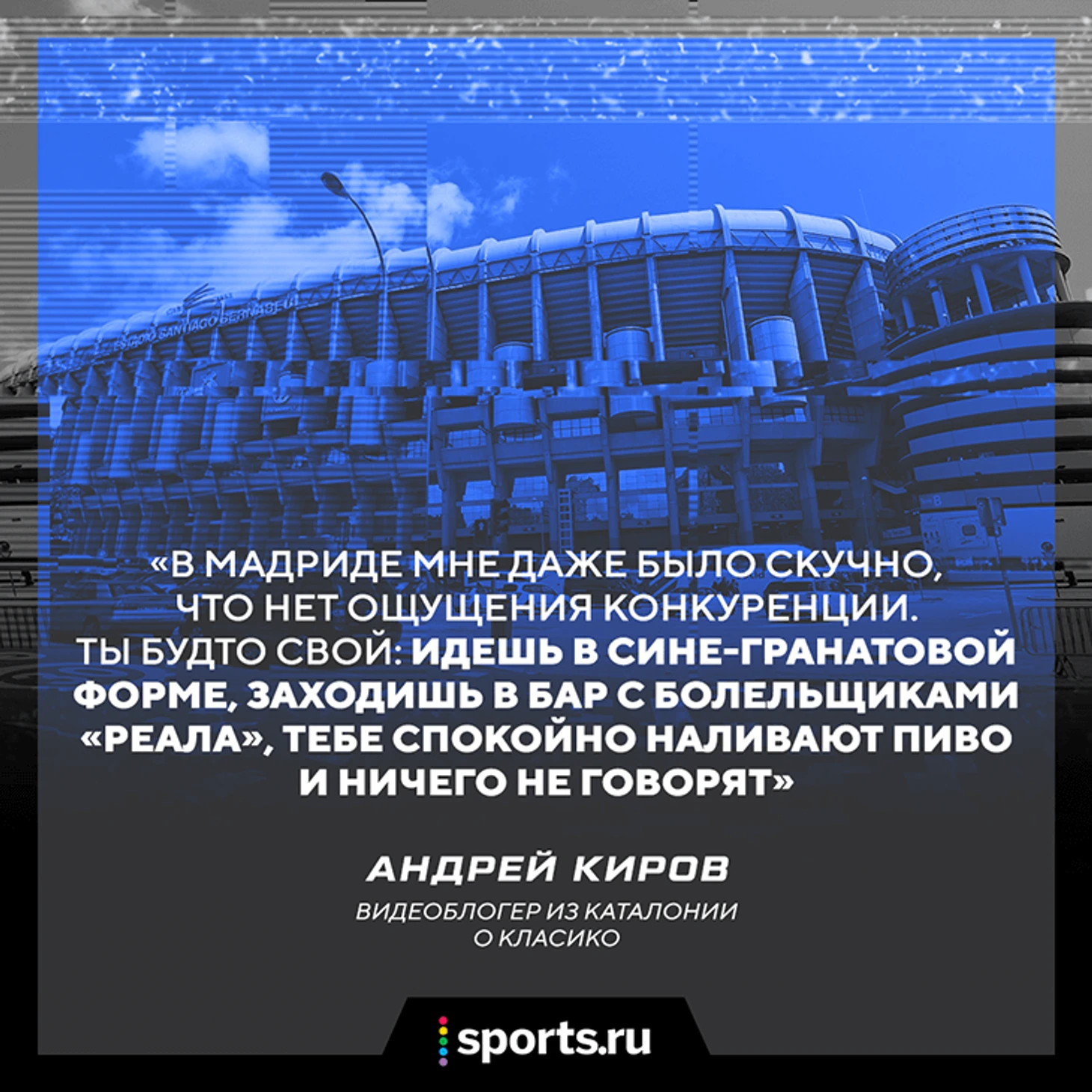 – А почему нет? Они в эти моменты спокойно сидят. Были бы кричалки за Испанию – кричали бы за Испанию. Это же нормально – выражать позицию словами, зачем устраивать физический конфликт? Мое первое эль класико в Барселоне было таким: бар, вокруг каталонцы и только за одним столиком сидят мадридисты. Тогда Бензема на 11 секунде забил самый быстрый гол в истории эль класико. Тот стол начал орать, каталонцы молчали, но пара человек возмущались и показывали им факи. Никто не вставал, не шел драться, потому что не принято, потому что ты сразу сядешь в тюрьму.