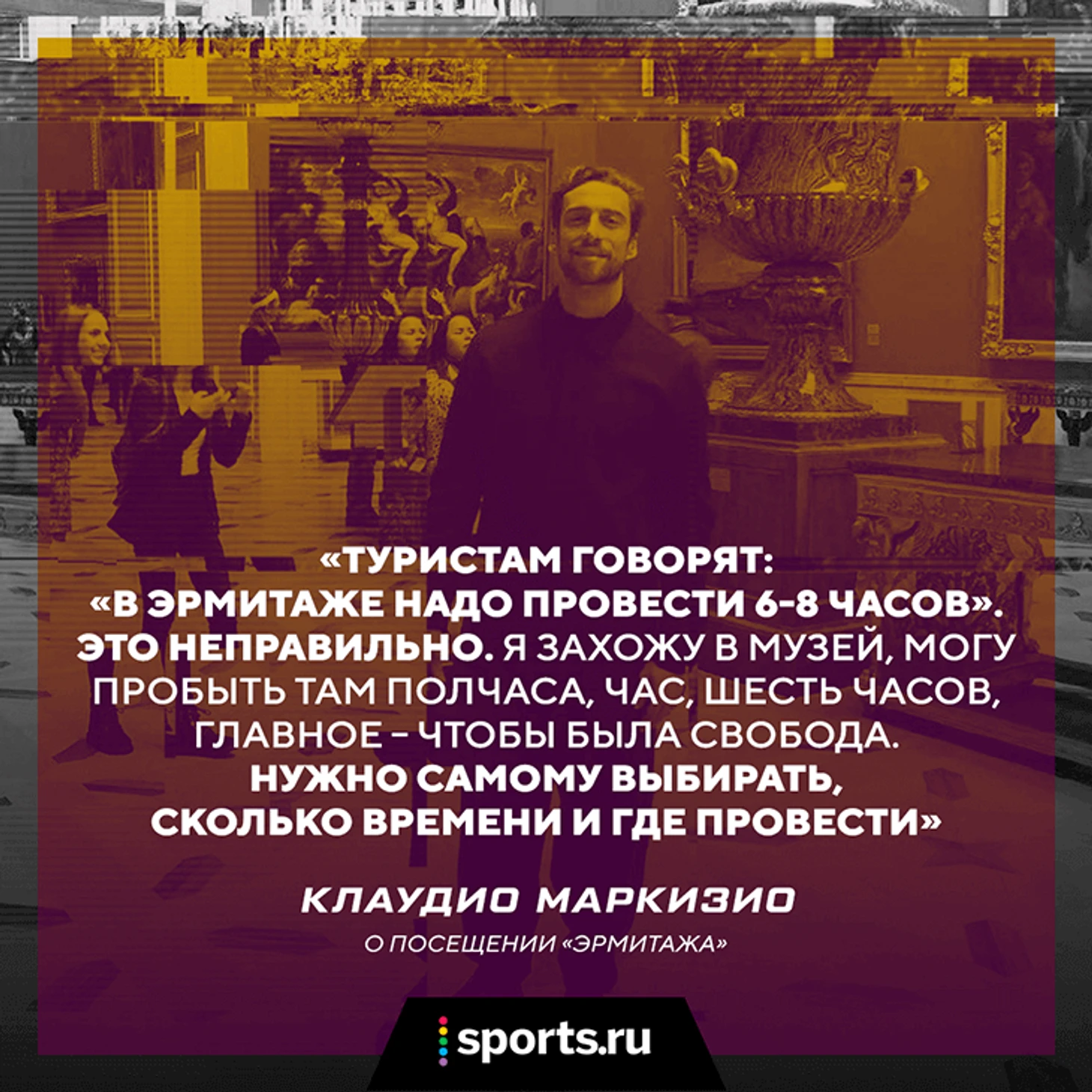Все это время Маркизио не сидел дома: снялся в рекламе одежды «Зенита», гулял с журналистами по Русскому музею и анализировал картины (Клаудио полюбил музеи, потому что чувствовал в них уединение), рассказал Елизавете Туктамышевой о запахе футболки Бекхэма. А еще часто пользовался инстаграмом: показывал, как едет по Петербургу на машине, пьет кофе, слушает русскую музыку, радуется снегу на балконе. Семака даже подкололи, что Маркизио прославляет Петербург только за счет инстаграма, на что главный по «Зениту» ответил: «Это тоже нужно».