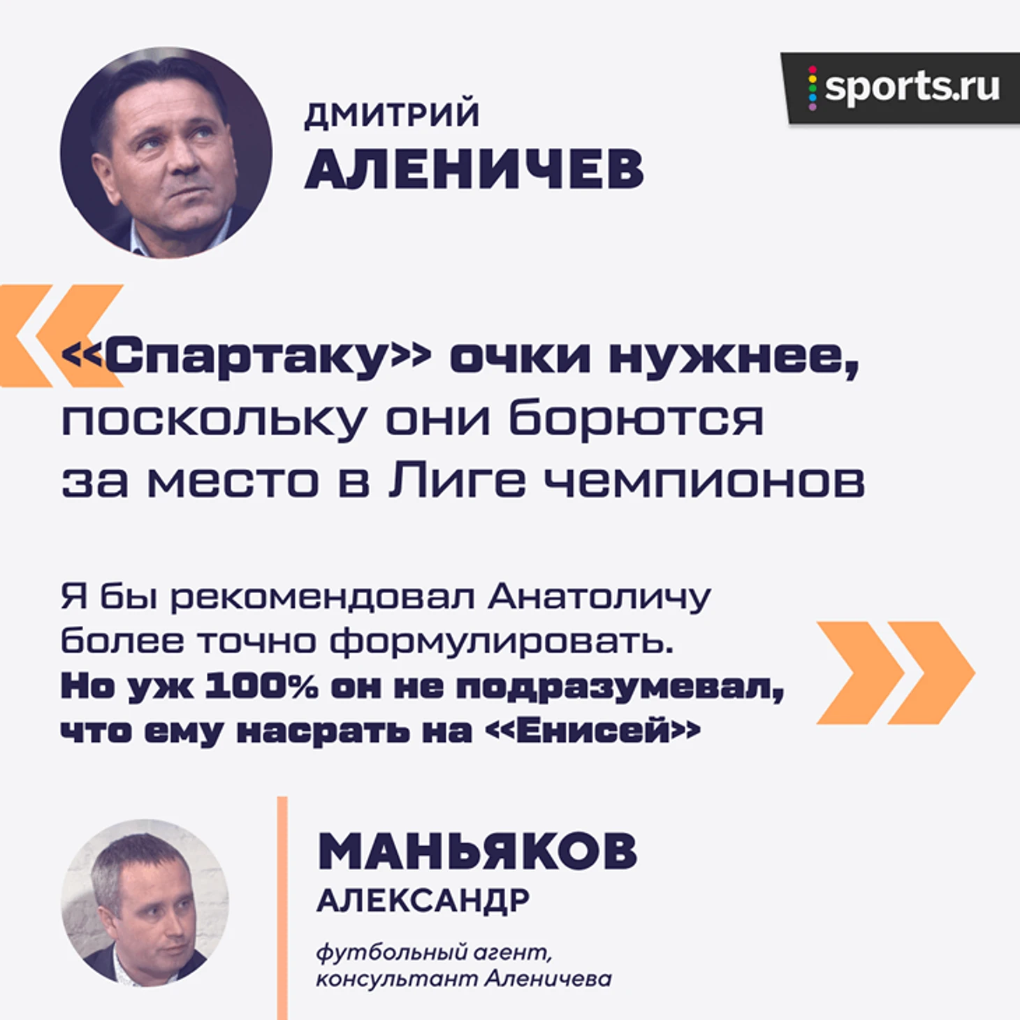 «Я бы рекомендовал Анатоличу более точно формулировать, – прокомментировал слова Аленичева друг и консультирующий его агент Александр Маньяков. – Но уж 100% он не подразумевал, что ему насрать на «Енисей».
