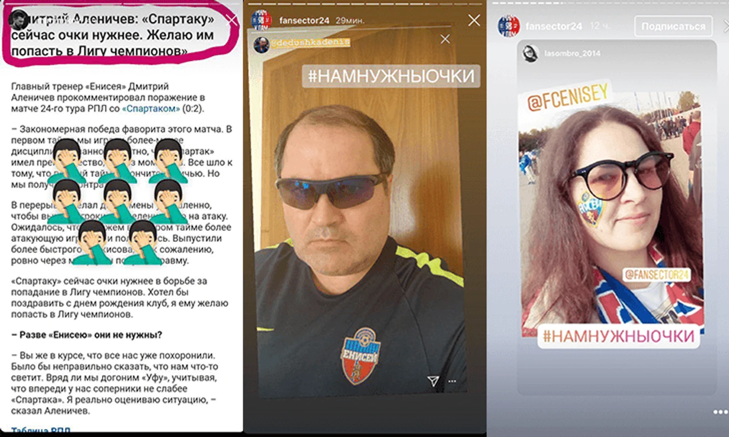 Болельщики поддержали запущенную Петровским акцию #НамНужныОчки, выкладывая фото в очках в соцсети. К ней присоединился директор клуба Денис Рубцов. На матче с «Оренбургом» (2:1, первая победа в Красноярске за сезон) фанаты «Енисея» вспоминали Аленичеву фразу про очки: выкрикивали «Он не тренер, он проститутка» и вывесили баннер «Аленичев, забери свое хозяйство», повесив поверх мешочек, похожий на яйца. «Я абстрагирован от этого, многое видел в футболе, – высказался Аленичев после матча. – Зачем мне обращать внимание на кучку каких-то ненормальных людей?».