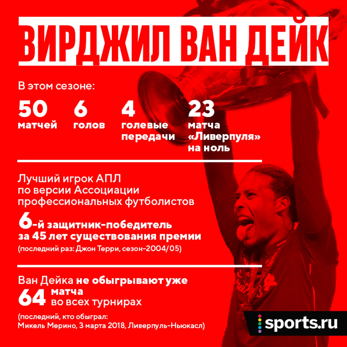 Просто цифры Ван Дейка в этом сезоне: 50 матчей, 6 голов, 4 голевые передачи, 23 матча «Ливерпуля» на ноль. УЕФА выбрала его лучшим игроком финала Лиги чемпионов.