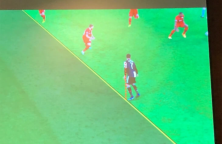 2. Ищется крайняя точка тела Роналду – ближайшая к чужим воротам. Судьи определяют, что это плечо, и проводят проекцию – по этой точке и пройдет красная линия.
