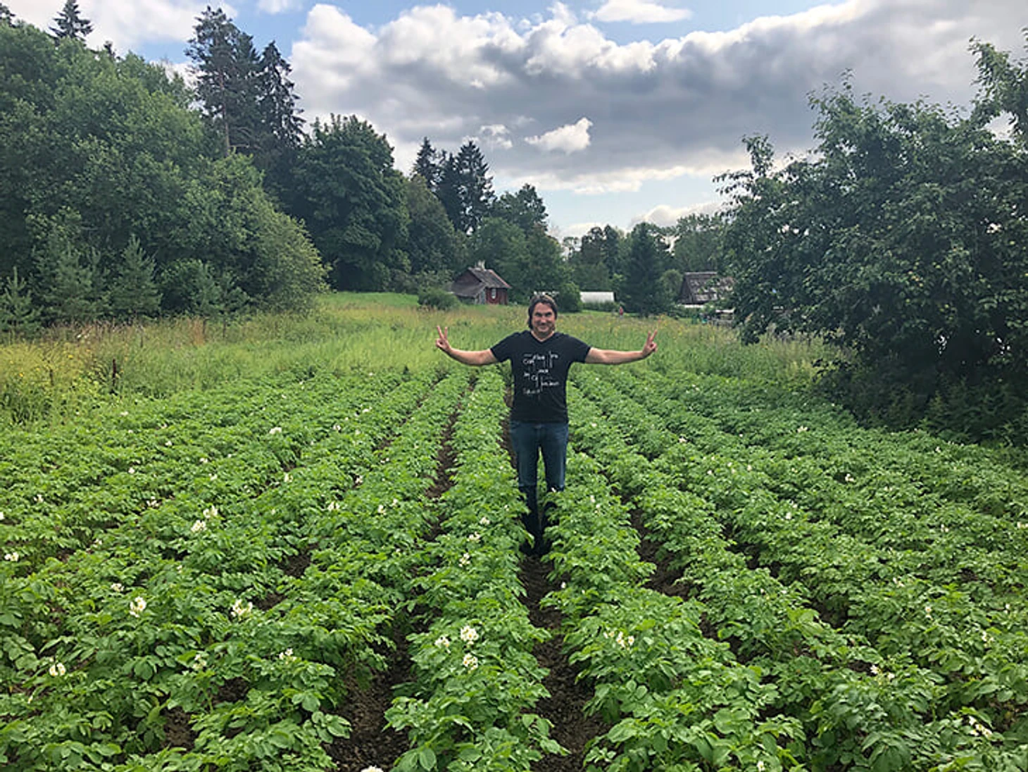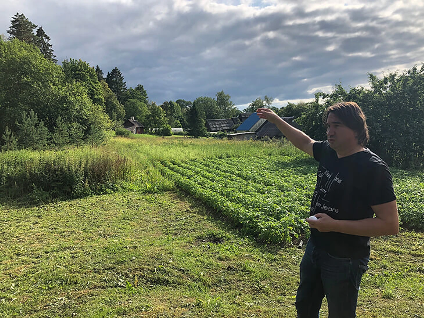 Радченко растопыривает пальцы и бродит между зелеными кустами с белыми цветочками – тут растет особый вид картошки, которую Дмитрий когда-то случайно откопал: