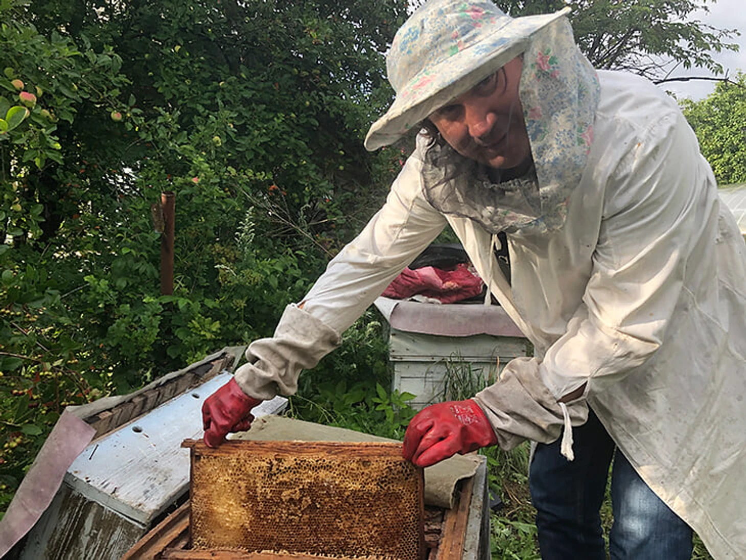 Осенью, когда пчелы все лето отработали и заполнили соты, Радченко устраивает медогонку в специальной трубе: подогревает механизм, вставляет рамки с сотами, вращает ручку – из крана льется свежий мед. А зимой утепляет ульи ненужными одеялами: «Чтобы пчелки не замерзли».