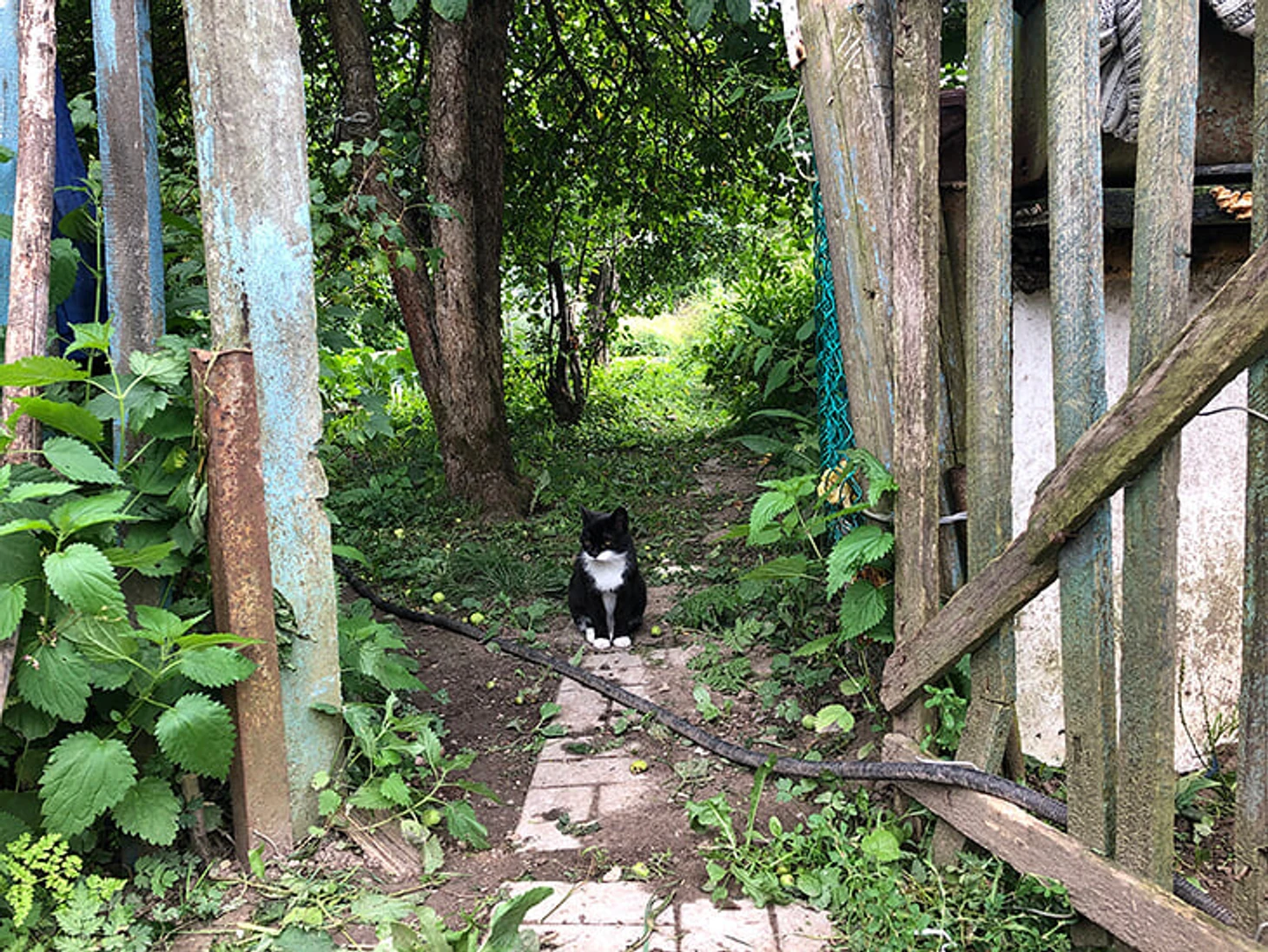 Пробираемся через калитку, которая на самом деле не нужна: по бокам никаких заборов, а только салатовые поля с фиолетовыми цветками, бродят курочки, за домом начинается лес, с одной стороны – поле, с другой – сразу же соседи. Полная свобода и открытое пространство, поэтому на участок Радченко в любое время может зайти пятилетняя соседка Кристина – побегать, поиграть с собакой и курочками, попить чай с Зинаидой Дмитриевной, которая в теплую погоду выносит на природу стул и сидит вместе с завывающей Лялей, опершись на палочку. Иногда в их компанию прибегает безымянный черно-белый деревенский кот.
