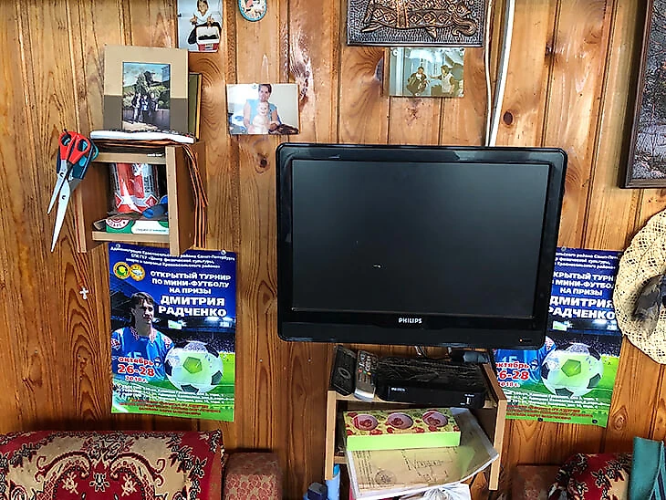 Сервант, кровати, деревянные шкафы и полки с классикой перенесли из старого дома, новую мебель родители просто не захотели. На стенах и в уголках зеркал большой комнаты со столом и диваном полно старины: Радченко с дочками, афиша его благотворительного турнира, с Валуевым, папа с внучками, семейное и футбольное, прицеплена соломенная шляпка, висят георгиевские ленты, картина с индюком и бусы.