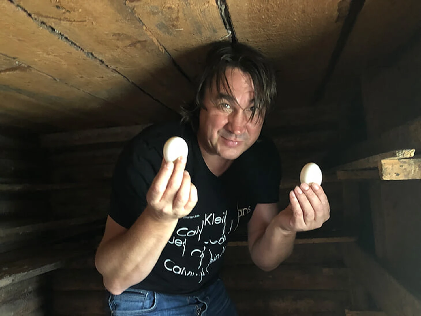 Пролезаем в деревянную избушку: на полу валяются перья, семь курочек вышли погулять вместе с защитником-петухом, который в последнее время начал бить Зинаиду Дмитриевну шпорами. Радченко опускает руку в куриный домик и достает два белоснежных яйца: