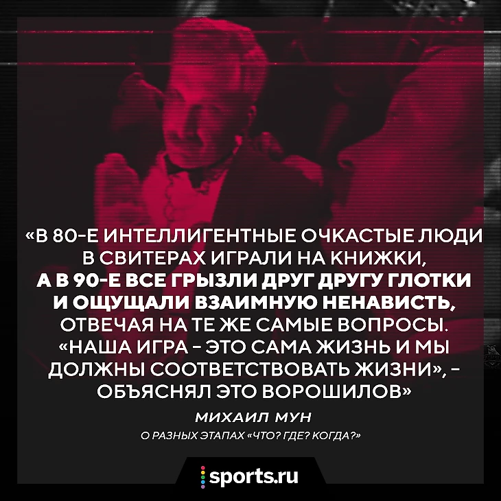 В 1985 году интеллигентные очкастые люди в свитерах играли на книжки (такими тогда были призы – Sports.ru), которые в неспешном темпе объявляла милейшая пожилая женщина, люди спокойно обдумывали вопросы в атмосфере взаимного уважения. А в 1997 году все грызли друг другу глотки и ощущали взаимную ненависть, отвечая на те же самые вопросы.