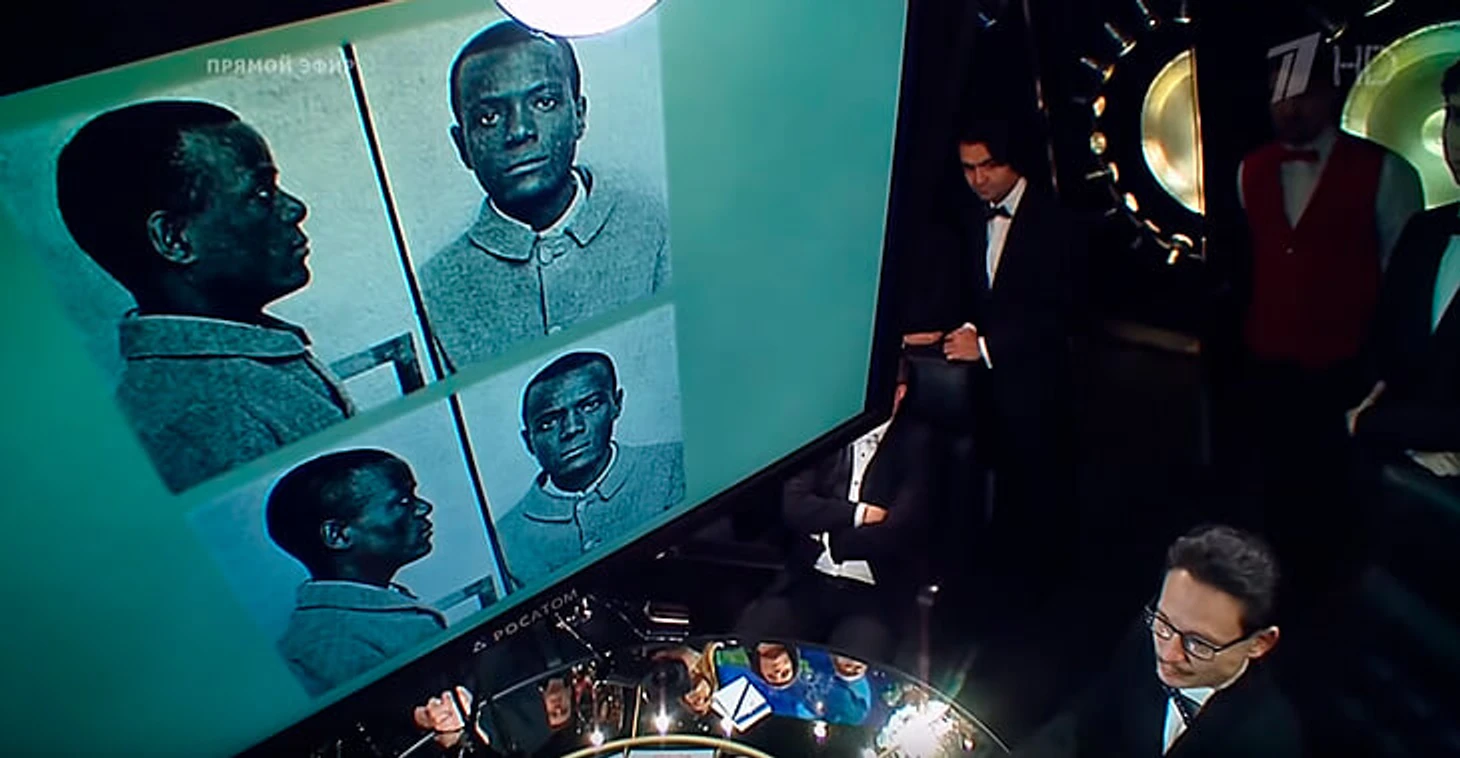 Приведу вопрос блица из первой игры зимней серии. Показывают явно полицейскую фотографию двух чернокожих и спрашивают: «Что было внедрено в США благодаря этим фотографиям?». Вначале команда задается вопросом: «Это один человек или разные?». И приходит к выводу, что разные, но очень похожие.