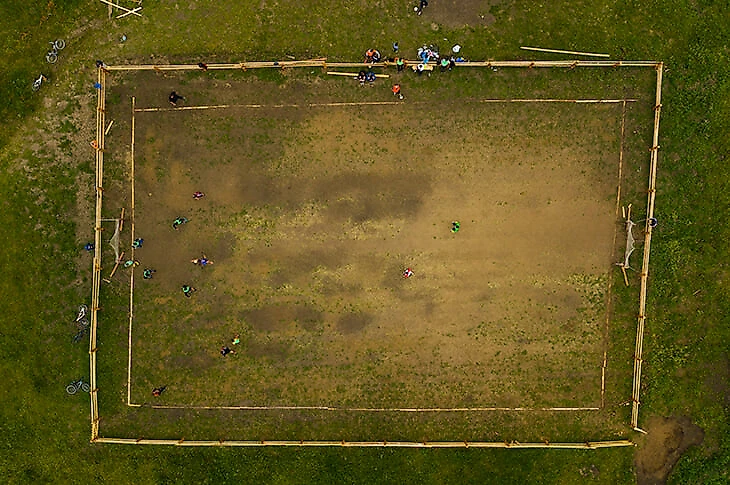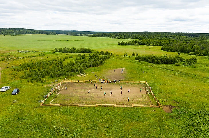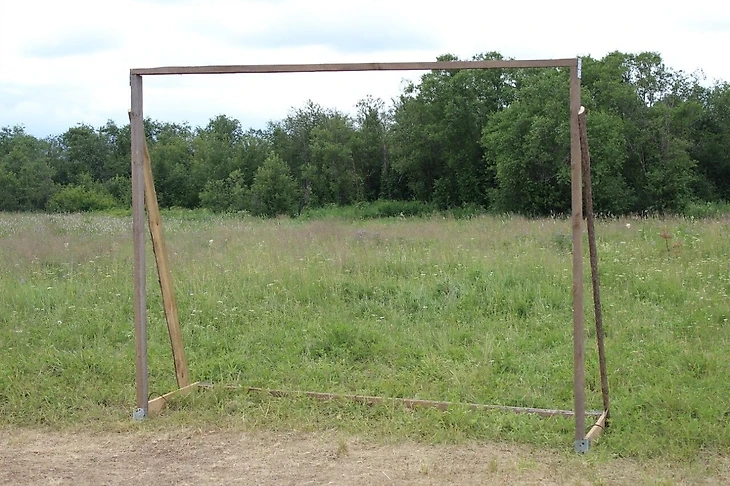 Эту землю арендовал местный фермер – его право, так что никаких обид, в 2012-м мы пошли с футболом через реку – на место, где в 60-е стоял спортивный комплекс из футбольного поля, турников и бревен, где в праздничные дни односельчане дрались подушками. От всего этого остались дряхлые столбы – мы их оставили на память и стали делать поле своими руками.