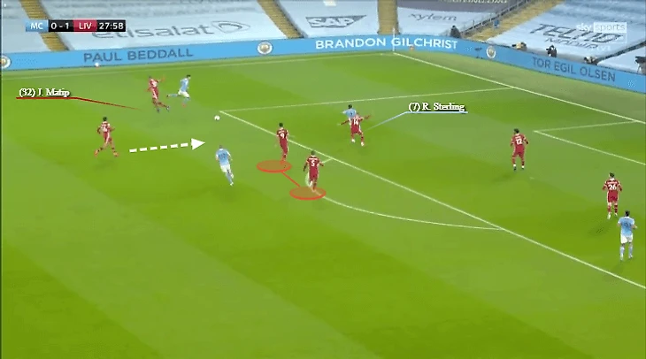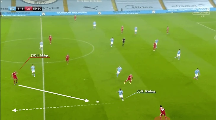 Чуть позже пас от Матипа, предназначенный Александер-Арнолду, был перехвачен Стерлингом, который сразу стал прорываться вперед.