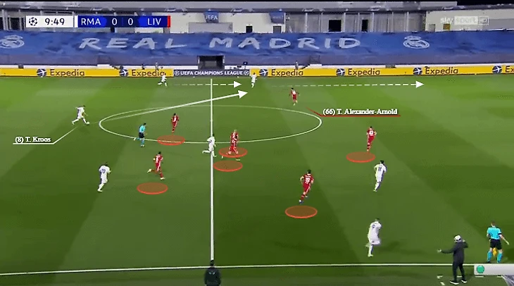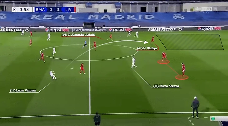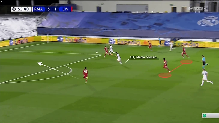 Когда Асенсио передал мяч Менди, «Ливерпуль» переместился для поддержки Александер-Арнолда. Мохамед Салах помчался назад, чтобы поддержать своего защитника, когда полузащитное трио Наби Кейта, Фабиньо и Джорджиньо Вейналдум, который прикрывал Робертсона, также пришли туда.