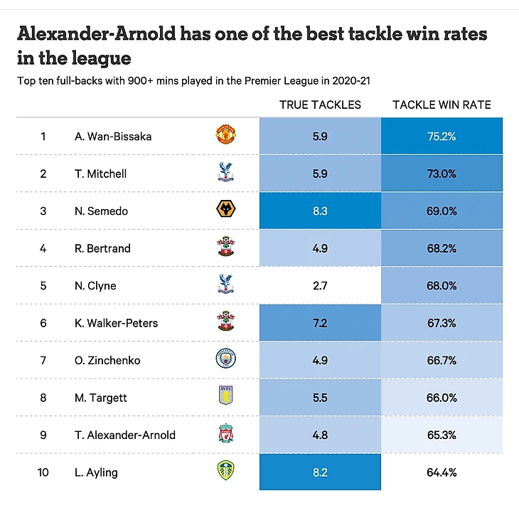Победа в воздушных дуэлях, возможно, и не является его сильной стороной, но Александер-Арнолда трудно пройти на дриблинге. Это заблуждение, что он не в состоянии остановить соперников, бегущих на него. Его «рейтинг прохода на дриблинге» в 28,8% показывает, что он был переигран гораздо реже, чем в прошлом году (43,3%).