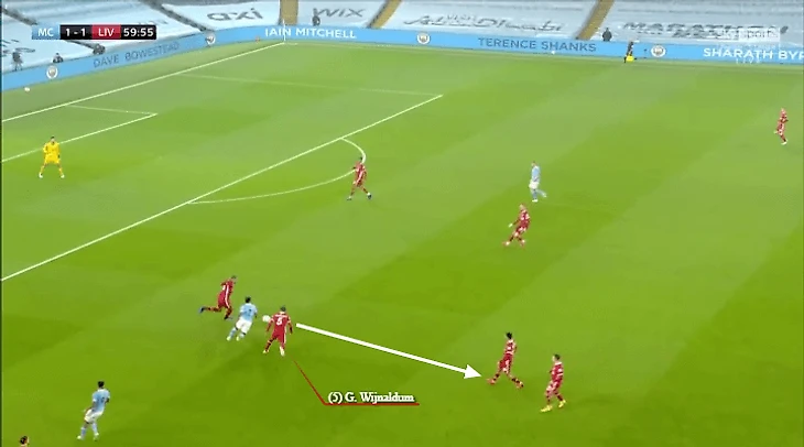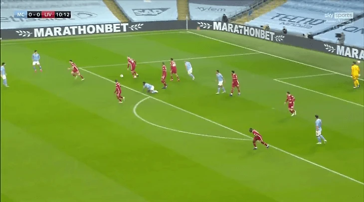 «Ливерпуль», похоже, в этом сезоне давит на своих соперников с меньшей интенсивностью, что может быть связано с массой вещей — казалось бы, бесконечным сезоном, отсутствием ротации у Клоппа. Но в матче против «Сити» они были на пике своей прессинговой игры. Когда Рахим Стерлинг получил мяч и сместился в сторону Александер-Арнолда, Диого Жота был там, чтобы оказать давление на Стерлинга.